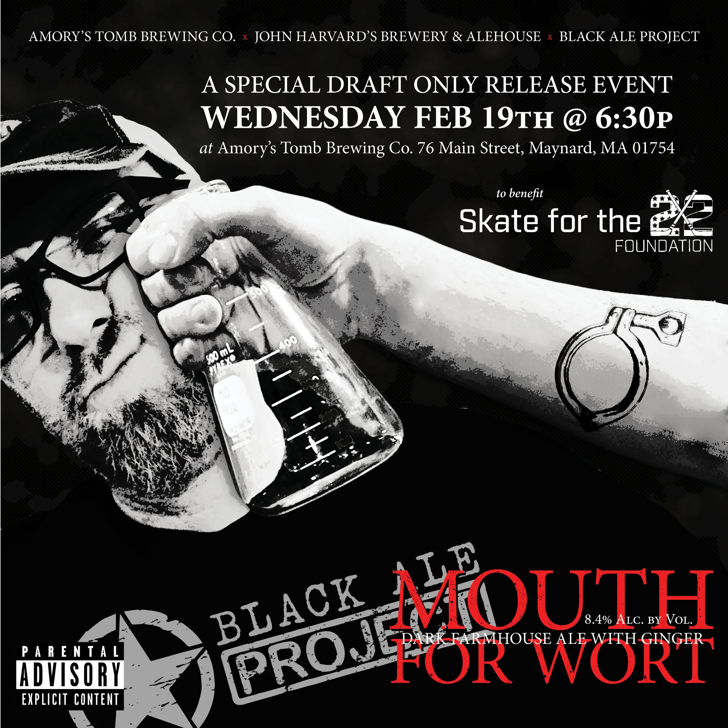 We've paired up with our friends at John Harvard's Brew House - Framingham and Black Ale Project to brew a special dark farmhouse ale with ginger. At 8.4% Alc. by Vol. this special draft only release, Mouth For Wort, truly packs a punch. A portion of the proceeds from every pint sold will go to the Skate for the 22 Foundation.